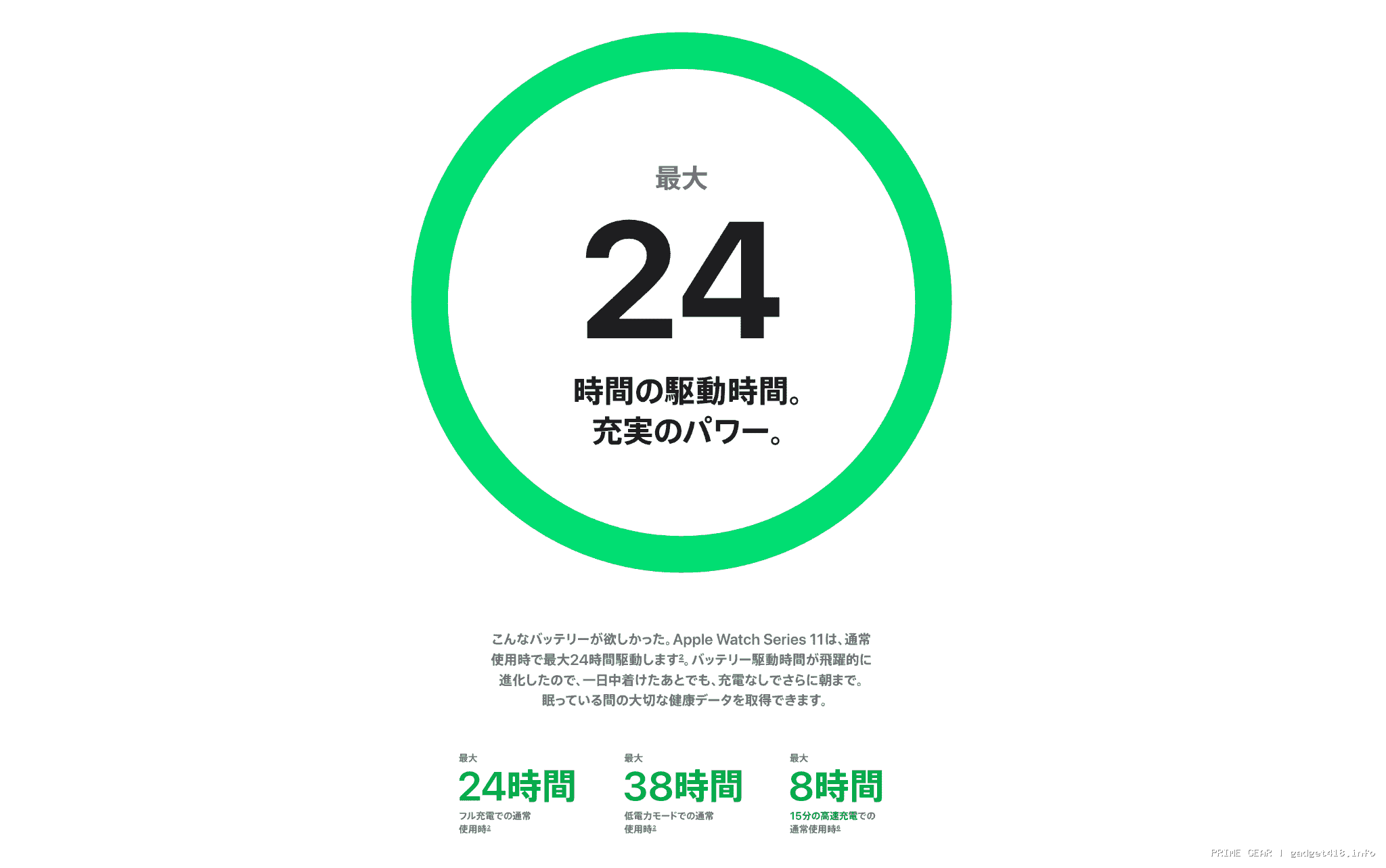 スマートウォッチの宿命ですが、現在のApple Watch series 11では、バッテリー持続時間が24時間となっています。